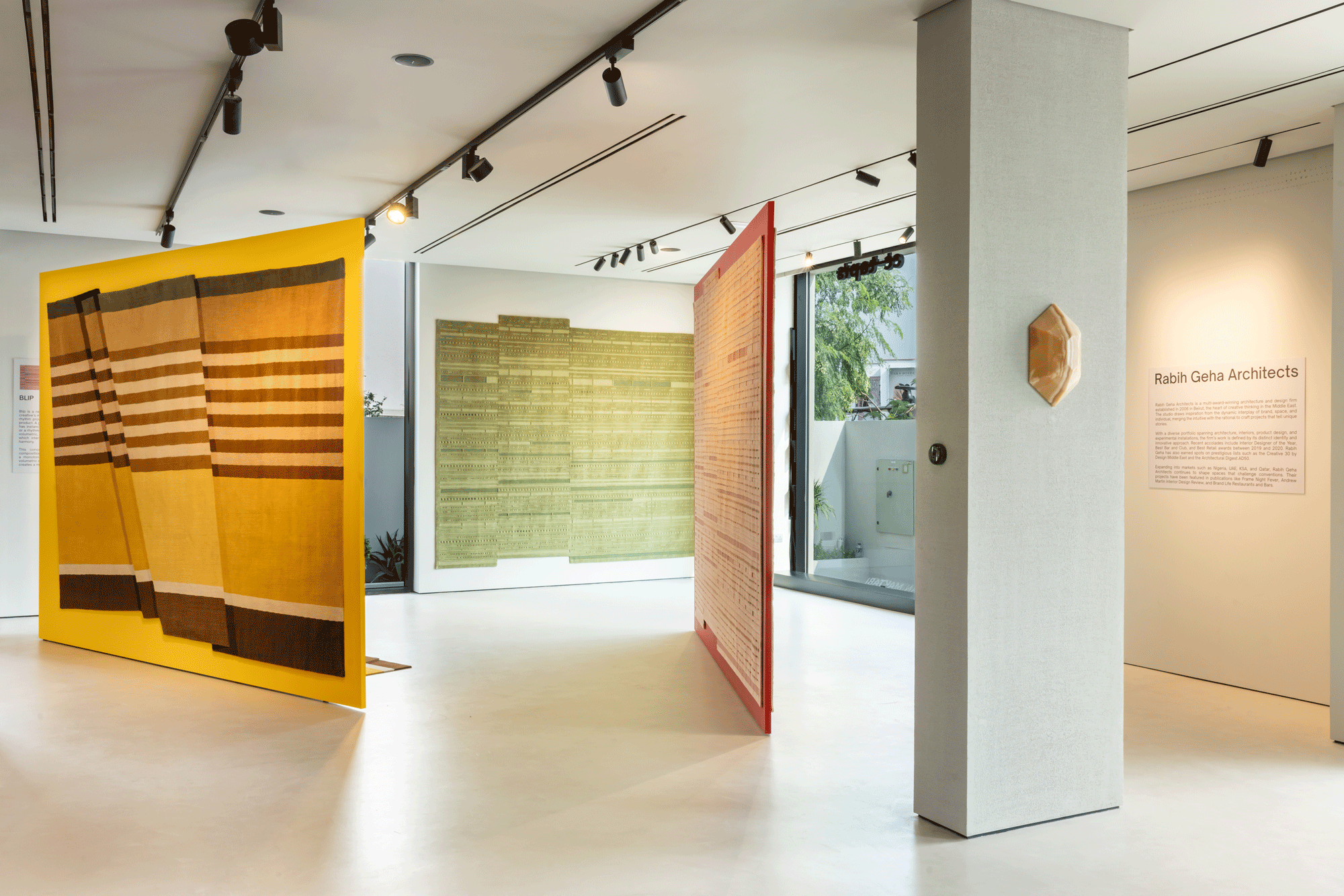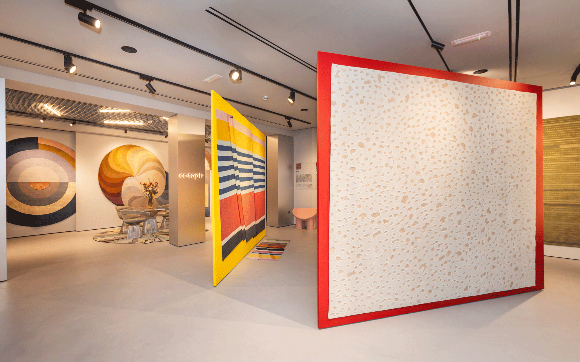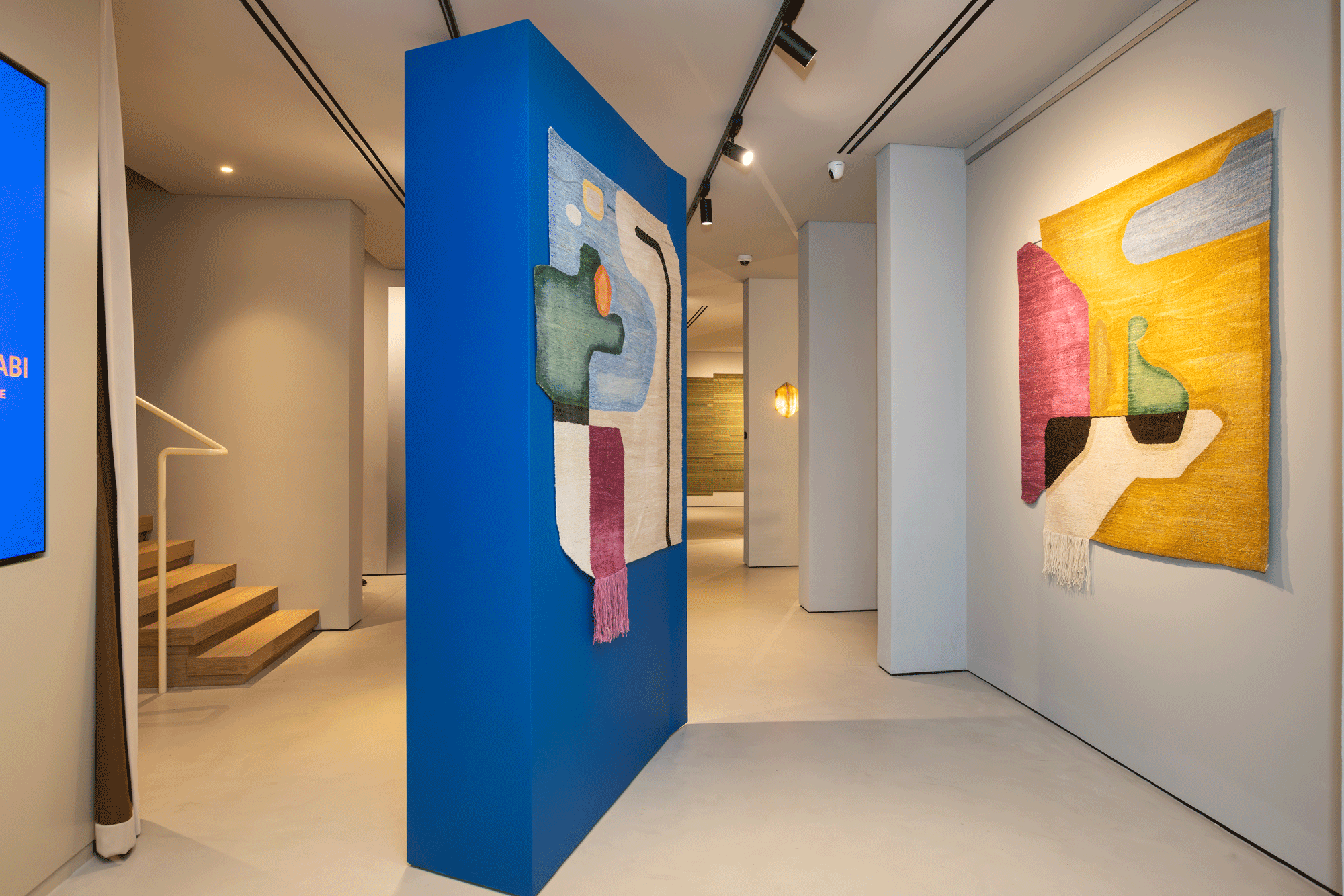 Three triangulated walls inject high chroma color and directionality in the space. Seen from the gallery vantage point, their tapered shapes give off a paper-thin impression to the walls, affording weightlessness and motion to the carpets on display.